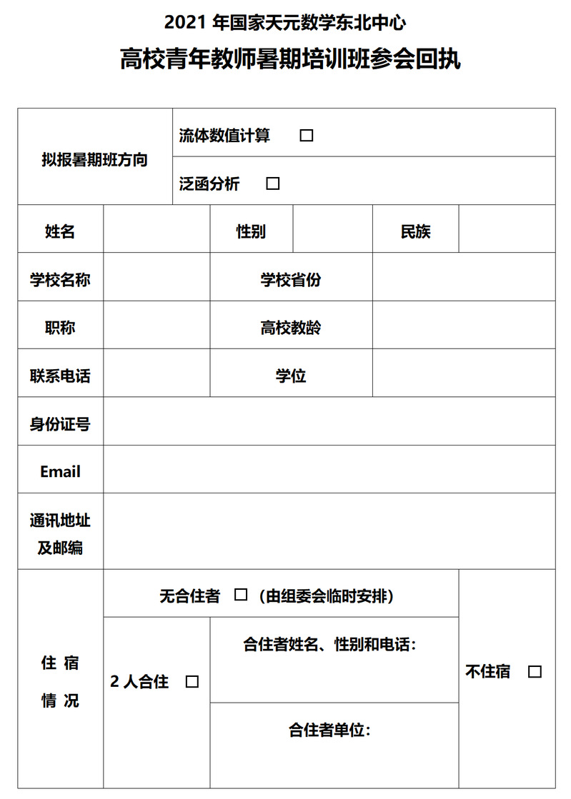 附件:2021年国家天元数学东北中心高校青年教师暑期培训班参会回执.docx