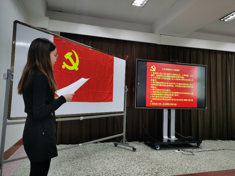 各党支部严格按照拟发展入党人员汇报自己对党的认识、入党动机、本人履历、家庭情况及向党组织需要说明的问题;入党介绍人介绍拟发展入党人员的有关情况和对其入党的意见;党支部委员代表支委会向大会报告对拟发展入党人员的培养考察和综合政审情况;到会党员充分发表意见;有表决权正式党员以无记名投票表决方式对拟发展入党人员能否被接收为预备党员进行表决;党支部书记宣读决议草案;有表决权正式党员以举手表决方式对决议(草案)进行表决;拟发展入党人员表明自己的态度等八项程序,“一人一议”,讨论接收了王可等37名同志为中共预备党员。