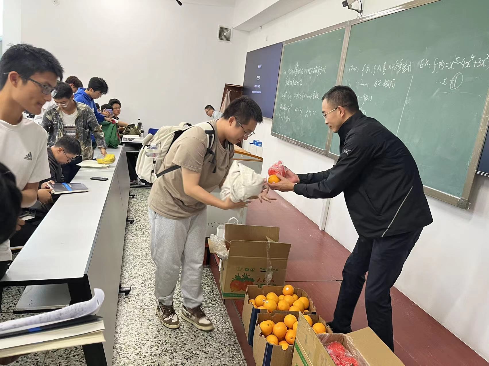 在中秋节、国庆节到来之际,太阳成集团tyc33455ccww院长樊赵兵、院党委副书记牟道富、辅导员李晋如、院团委主要学生干部走进《高等代数》课堂,为65名2023级本科生送上“双节”祝福。