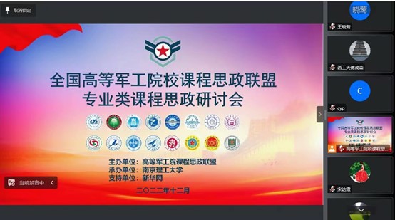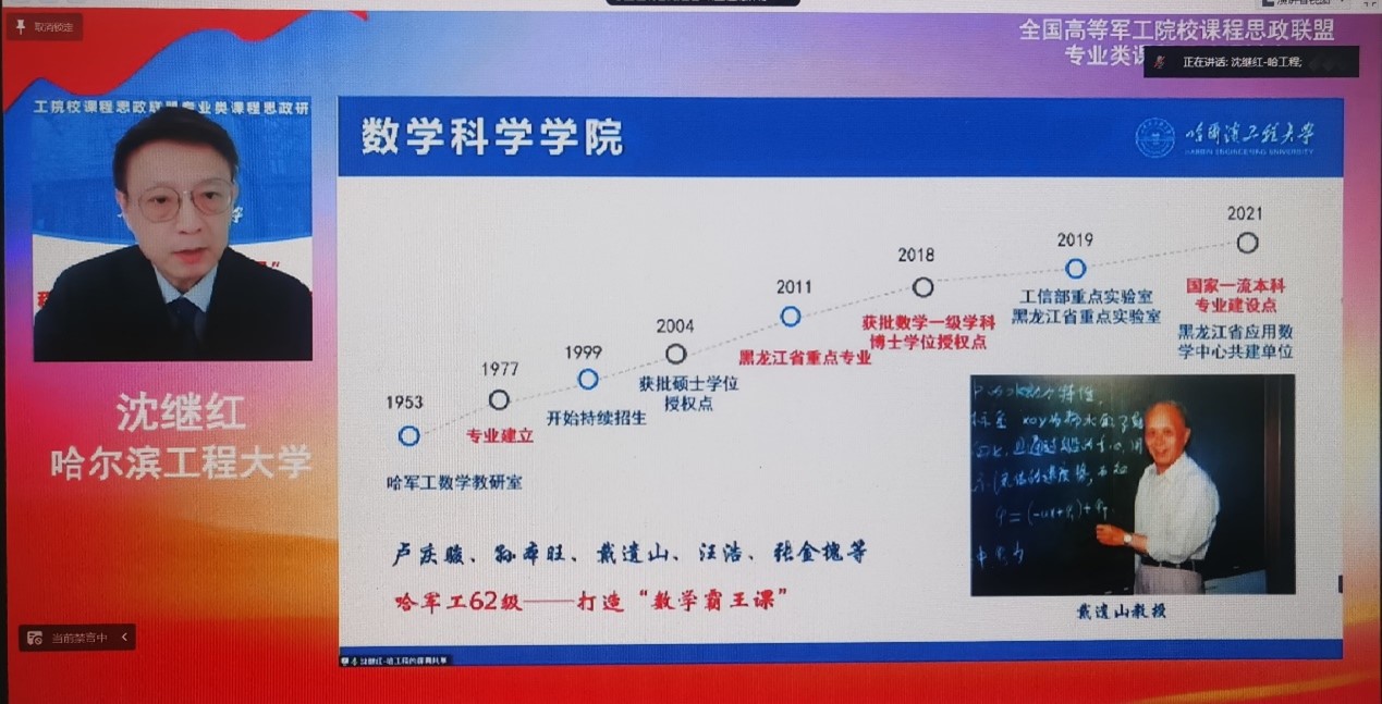 12月3日,全国高等军工院校课程思政联盟院校专业思政研讨会暨信息、数学及外语类课程思政建设交流研讨会以线上线下相结合方式召开,本次会议由南京理工大学主办。教育部高教司、工信部人教司、江苏省教育厅、新华网相关负责人,哈军工分建院校及原兵器工业部部属院校的相关领导、专家、学者参会,数学学院院长沈继红教授线上参会并作主旨报告。