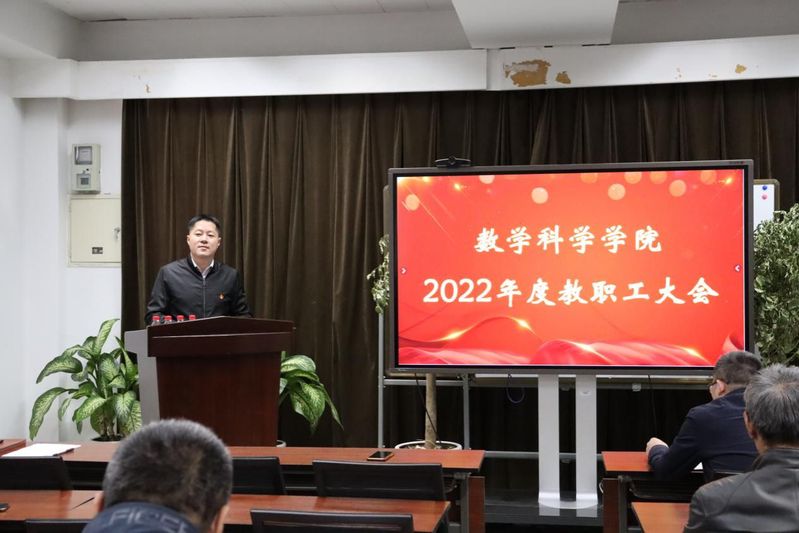 为深入贯彻落实学校“抓落实、促转型”的要求,4月19日,数学学院召开2022年度教职工大会。总结回顾了学院2022年工作并对2023年重点工作进行部署,学院全体教职工参加会议,会议由学院党委书记孙荣平主持。