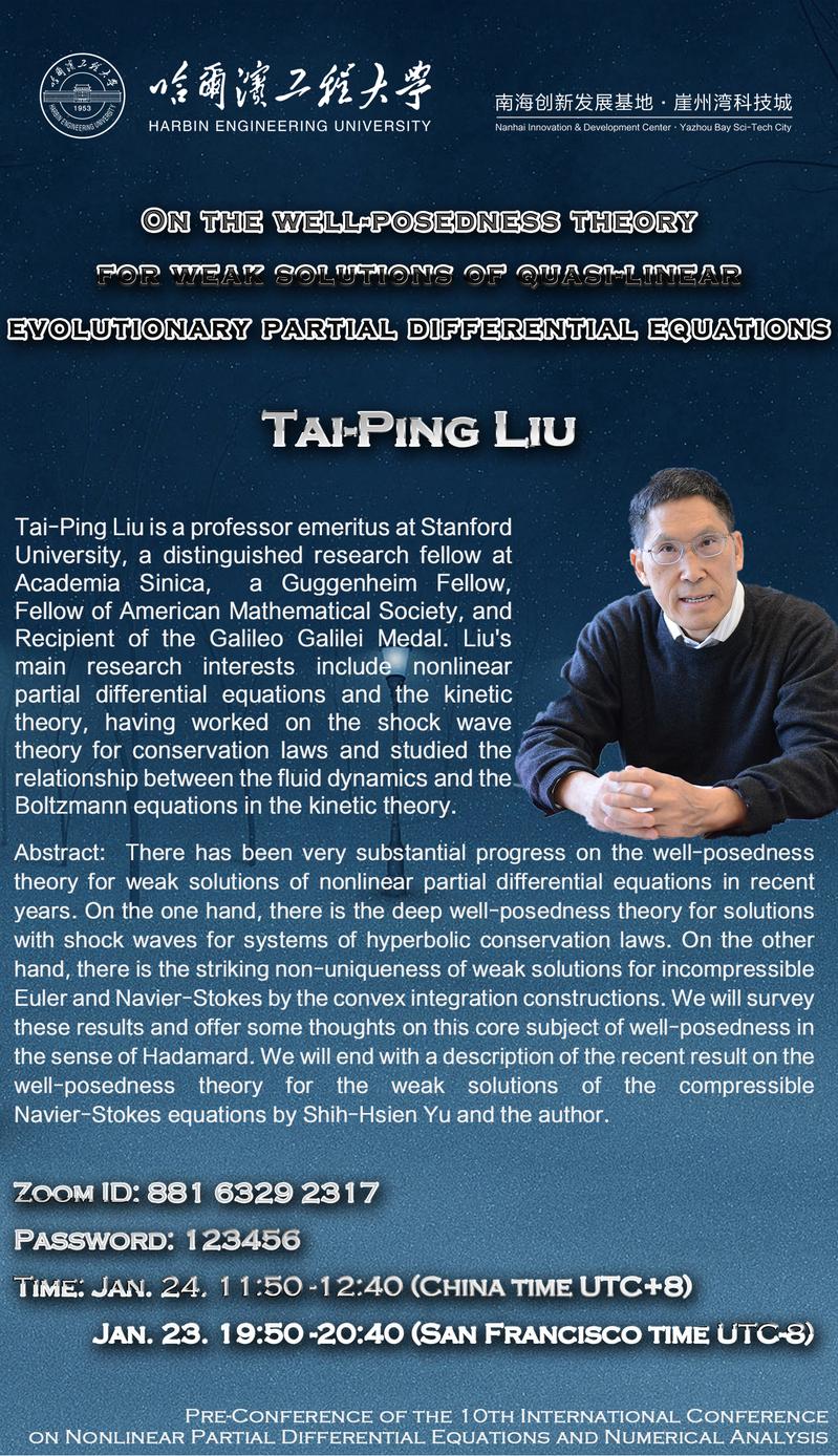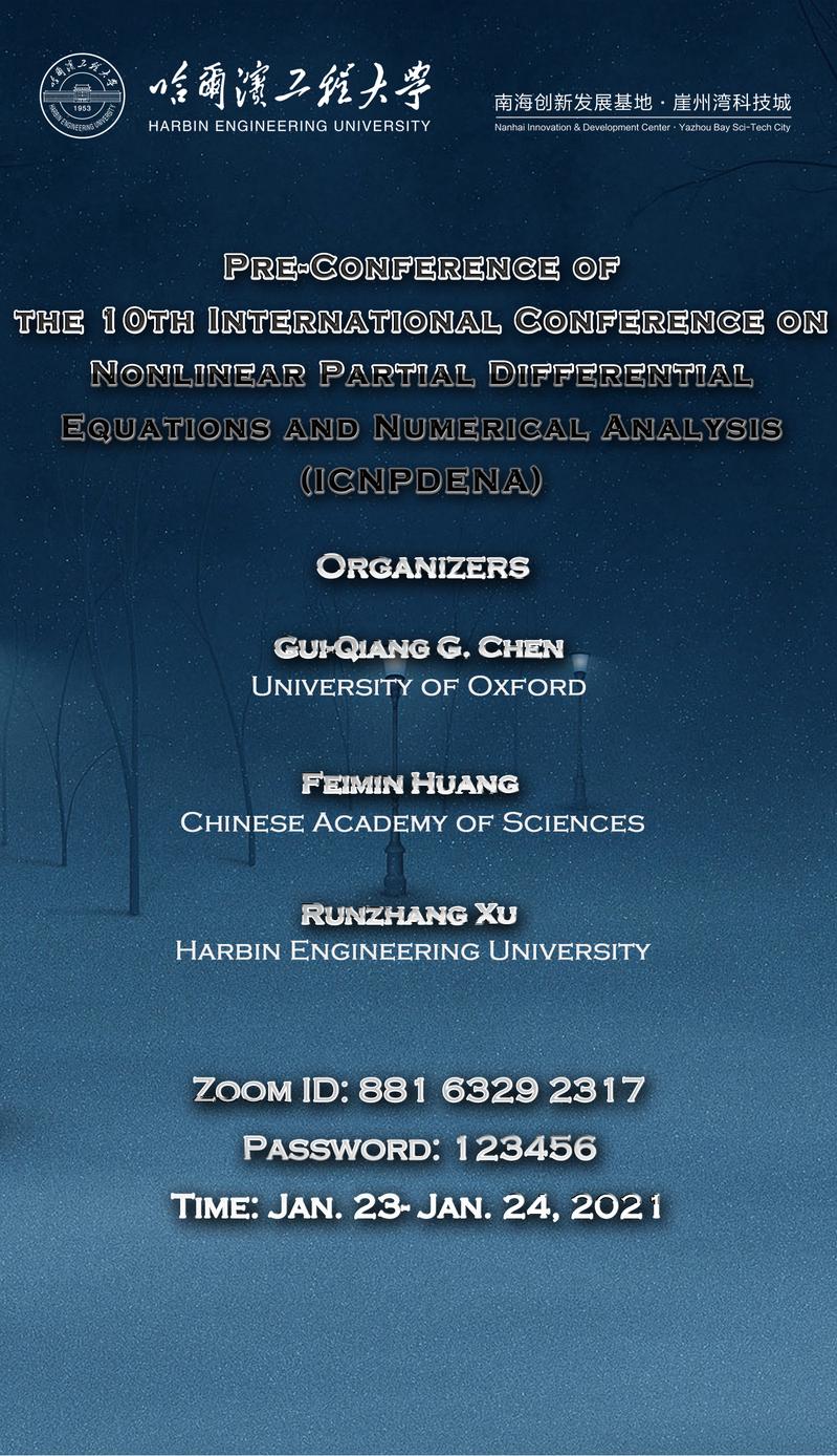 The ICNPDENA was first held in 1998 at the Beijing Fragrant Hills Park. However, as you were informed, due to the global pandemic, we had to postpone the 10th International Conference on Nonlinear Partial Differential Equations and Numerical Analysis, but we still hope that the academic exchanges will continue and the enthusiasm in the field will remain. Therefore, we decided to organize thisOnline & Offline Pre-Conference of the 10th-ICNPDENA. This pre-conference, co-organized by Professor Gui-Qiang G. Chenat University of Oxford, Professor Feimin Huang at Chinese Academy of Sciences and Professor Runzhang Xu at Harbin Engineering University, aims at promoting the international collaboration of outstanding mathematicians working with PDE. Invited speakers will address topics coming from numerous PDE applications, including geometry, probability, mechanic, biology, medicine, etc. This virtual and in-person academic correspondence not only share updated progress in the cutting-edge research areas but also enhance understanding and cooperation between mathematicians from different backgrounds, pure and applied mathematics, and computational mathematics.