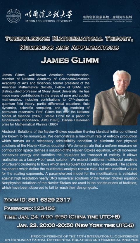 The pre-conference of the 10th-ICNPDENAis initiated by the Organizing Committee of the International Conference on Nonlinear Partial Differential Equations and Numerical Analysis, which will be held on January 23-24, 2021, at the Nanhai Innovation and Development Center of Harbin Engineering University, Yazhou Bay Sci-Tech City, Hainan Province China (Offline), and via ZOOM (Online).