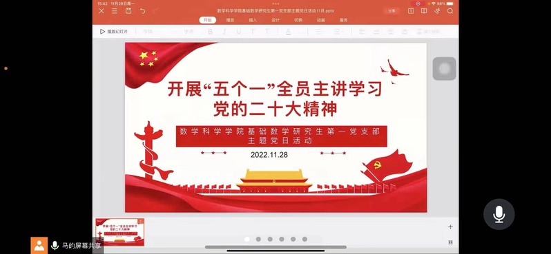 为深入学习贯彻党的二十大精神,引导全体党员把思想统一到党的二十大精神上来,坚持学用相长、知行合一,以更加主动的精神状态敢担当、善作为、抓落实。2022月11日28日,基础数学研究生第一党支部开展“全员主讲学习党的二十大精神”线上主题党日活动。