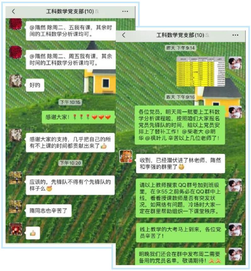 在全体党员的大力支持下,党支部书记与教研部主任创新提出“一备二”教学保障模式,一是指每个教学班由一位主讲教师负责在线教学,二是指两种备选的教学方案。如果主讲教师由于网络原因不能在QQ群正常直播上课,则由事先加入QQ群的党员教师作为替补来接管课堂、直播授课。如果替补教师也有网络故障等问题,则由研究生助教组织学生观看事先录制好的教学视频和智慧树平台上的慕课。在党支部全体成员的共同努力下,目前在线教学已顺利进行了一周,没有出现过一次意外,漂亮地打赢了线上教学战役的第一战。