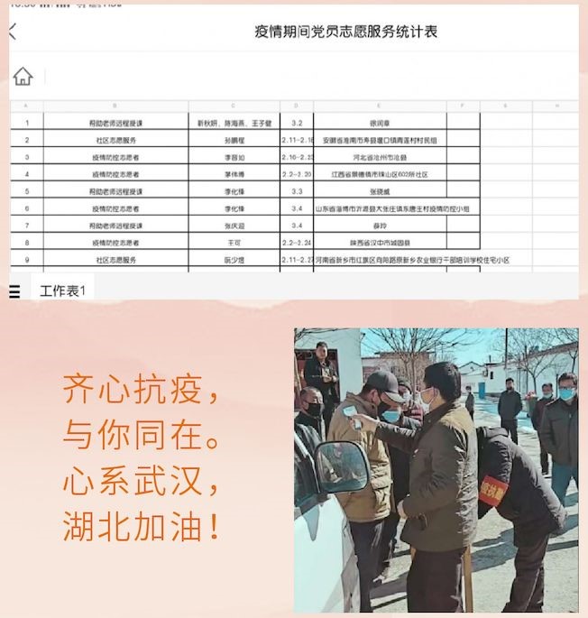 疫情期间支部党员积极做好疫情宣传,科普疫情防控知识,拍摄“武汉加油”视频,积极向学校、学院宣传平台投稿支部党员、入党积极分子在一线抗击疫情的感人事迹,学校官微、校团委微信公众号、学院公众号先后4次报道我支部党员、入党积极分子的先进事迹。