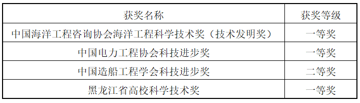 发表学术论文20余篇,其中SCI检索论文10余篇,TOP期刊论文2篇,申请发明专利8项,参与出版论著1部。相关研究成果获得中国海洋工程咨询协会海洋工程科学技术奖(技术发明奖)一等奖、中国电力工程协会科技进步奖一等奖、中国造船工程学会科技进步奖二等奖、黑龙江省高校科学技术奖一等奖各1项。