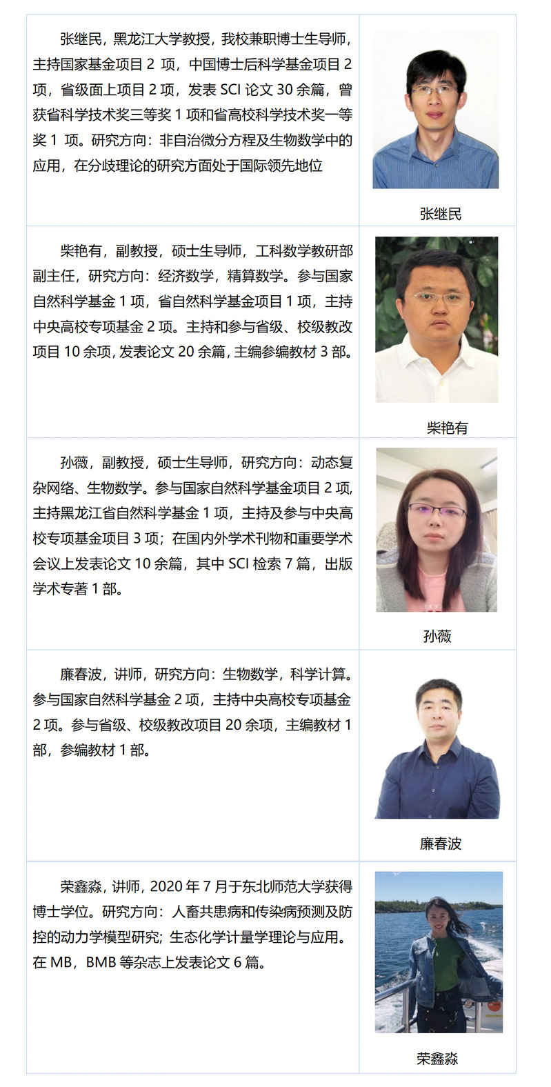 团队负责人:薛玲教授、博士生导师,生物数学团队学科带头人,黑龙江省重点实验室副主任。2013年获美国堪萨斯州立大学博士学位,2014年至2016年在美国杜兰大学数学系与数学计算科学中心从事博士后研究工作;2016年至2017年获加拿大太平洋数学研究院和加拿大曼尼托巴大学数学系的联合资助,在加拿大曼尼托巴大学数学系从事生物数学的研究工作;2016年来校工作,主要从事生物数学、复杂网络等方面的研究。主持国家自然科学基金项目2项, 参与完成美国国家自然科学基金、美国国家卫生院、美国国土安全部等科研项目多项。在Journal of Differential Equation、SIAM J Appl Math、PloS Neglected Tropical Diseases、Bulletin of Mathematical Biology、Journal of Theoretical Biology、Mathematical Biosciences等SCI 期刊发表论文30余篇。