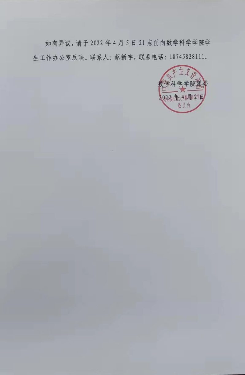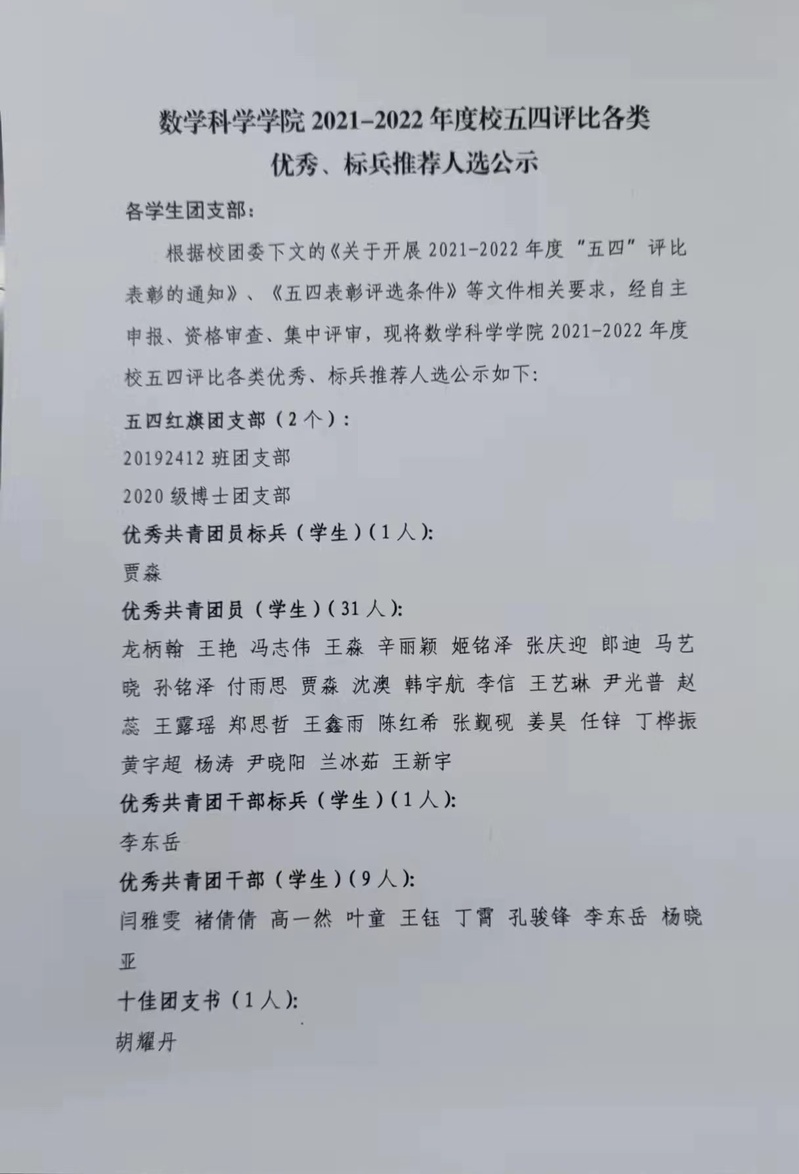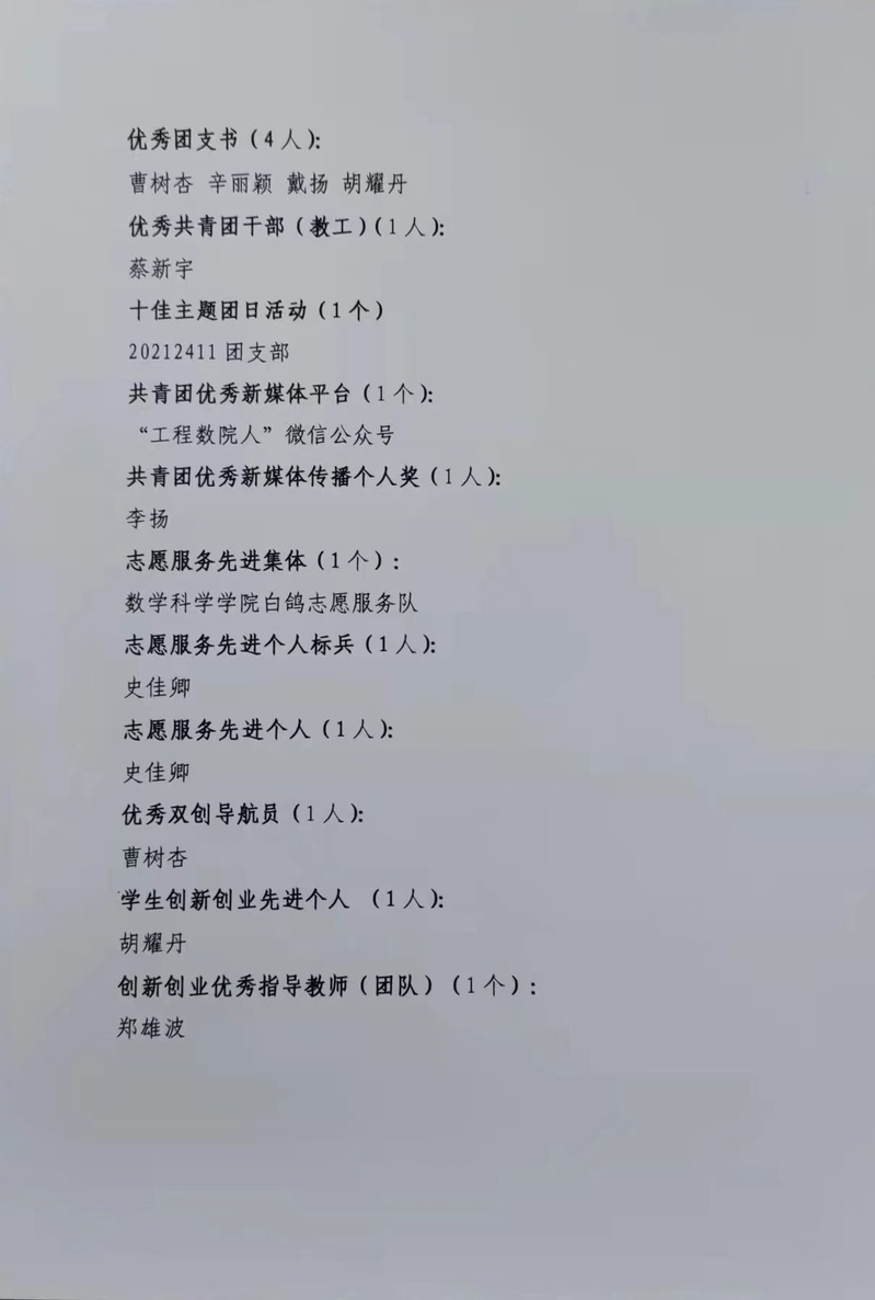 数学学院2021-2022学年度五四评比公示